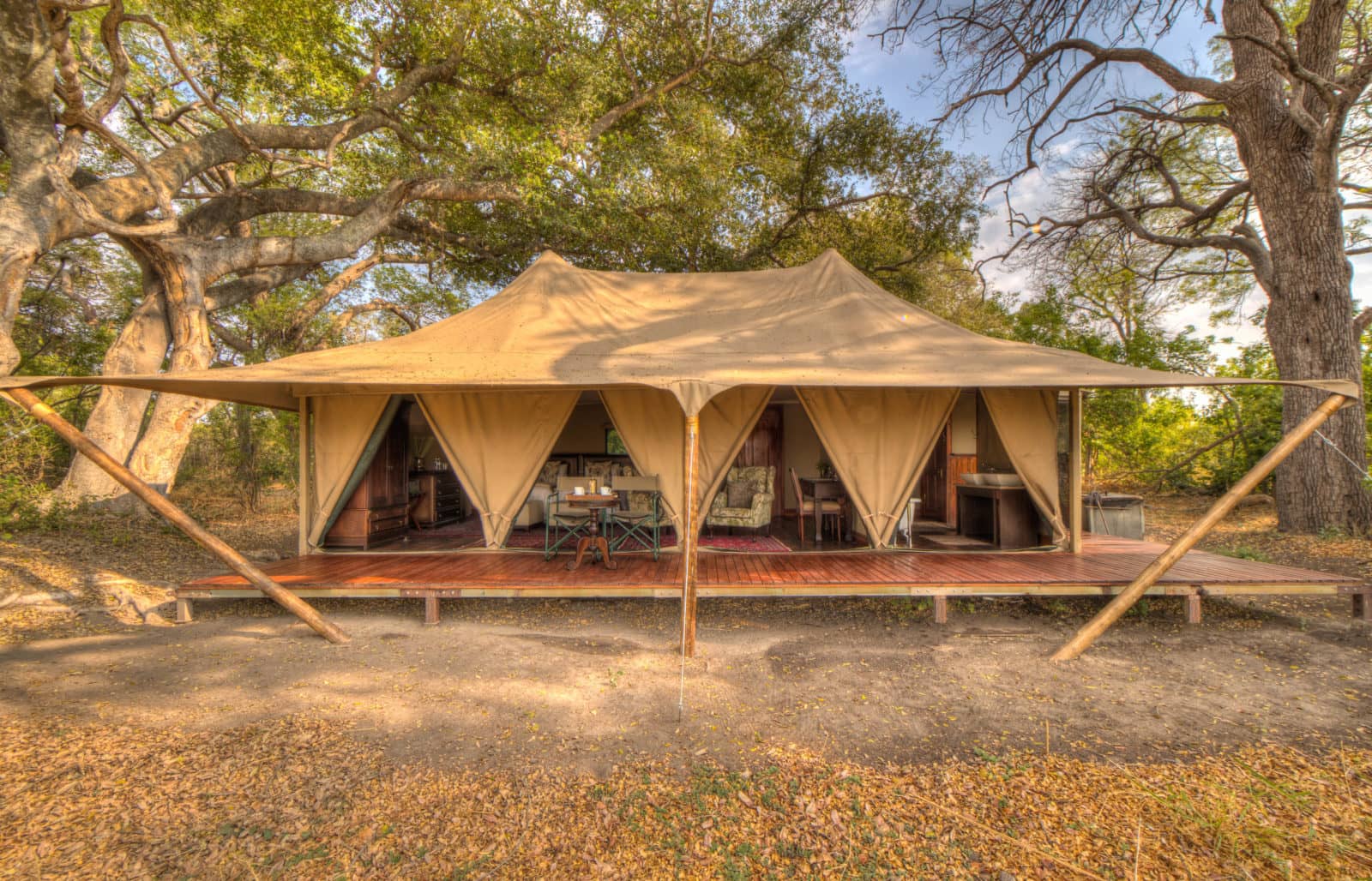 Kadizora Camp is part of An African Anthology group and is located in the private NG12 concession, on the seasonal floodplain between the Selinda Spillway and the Vumbura River. The camp consists of eight luxury and three standard tents which have either twin beds or a conversion to a double bed. Kadizora has now also opened their deluxe family villa, an exclusive use two-bedroomed tent providing private activities, ideal for families or small groups of friends. Each tent also boasts en suite bathrooms and an outdoor decking where guests can sit and admire the landscape from the quiet of their own room. They are well furnished in a classic safari style and have Persian style rugs and crewel work cushions and armchairs. The bedroom tents are positioned to provide seclusion and privacy whilst also offering fabulous views over the majesty of the floodplain.