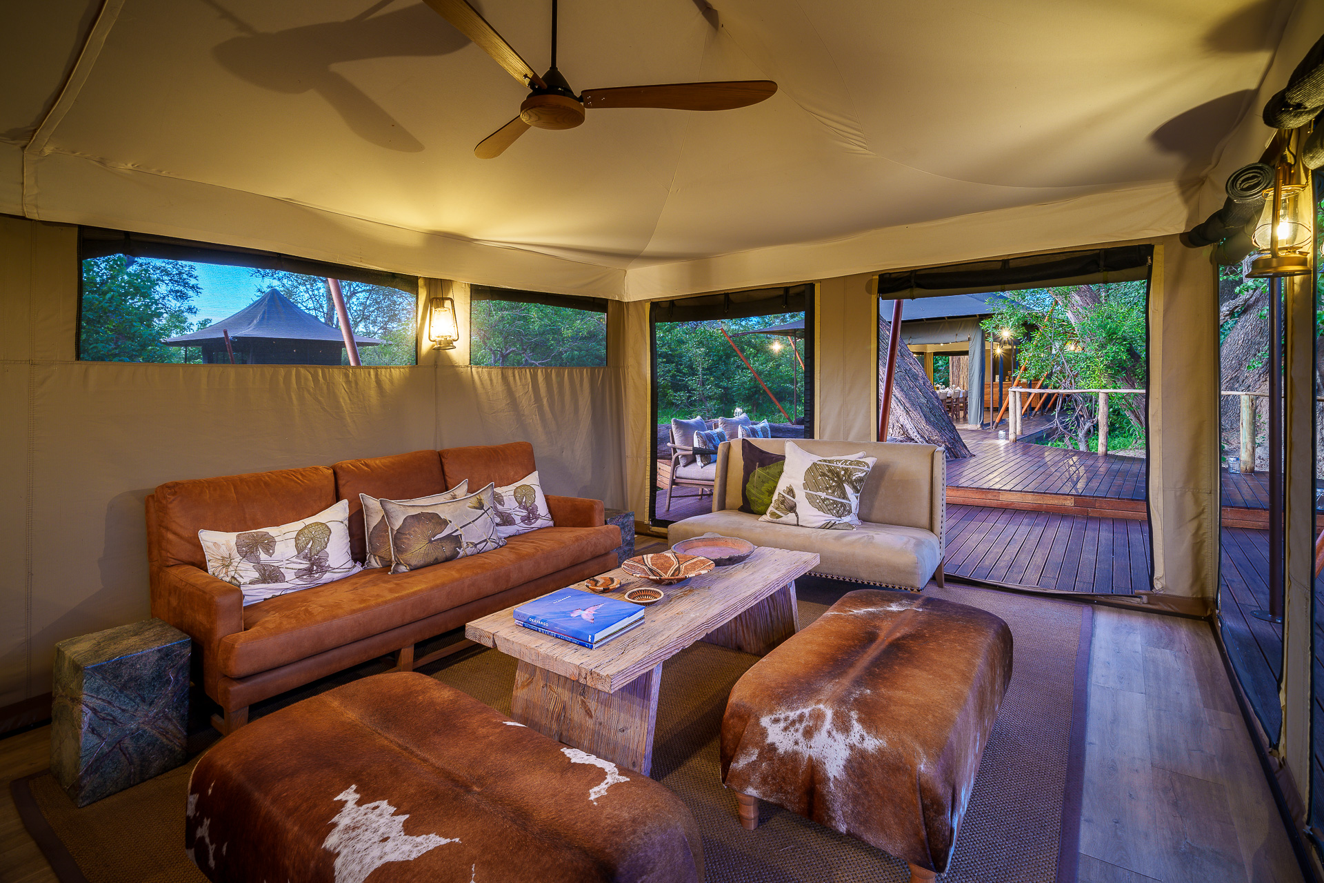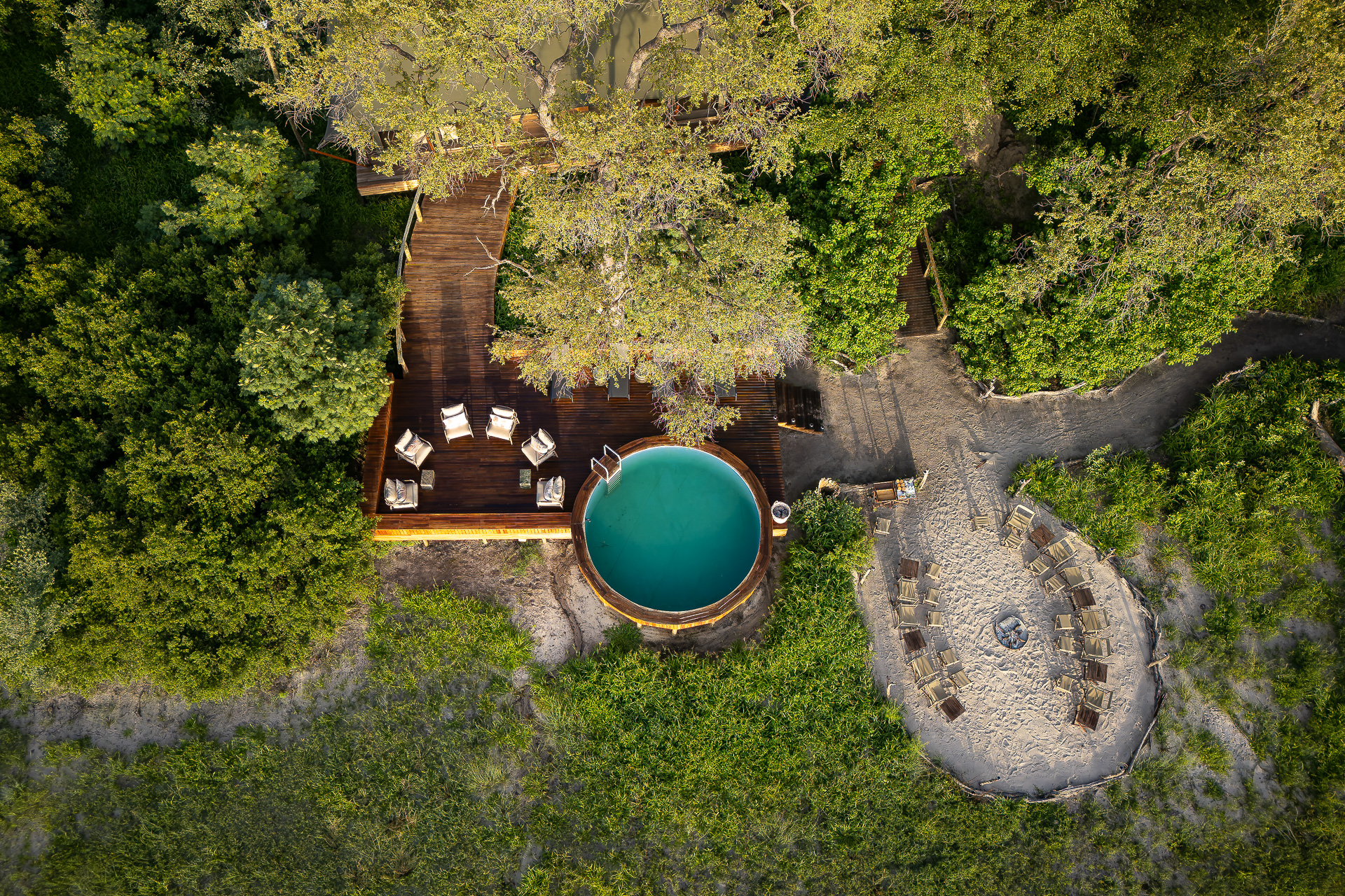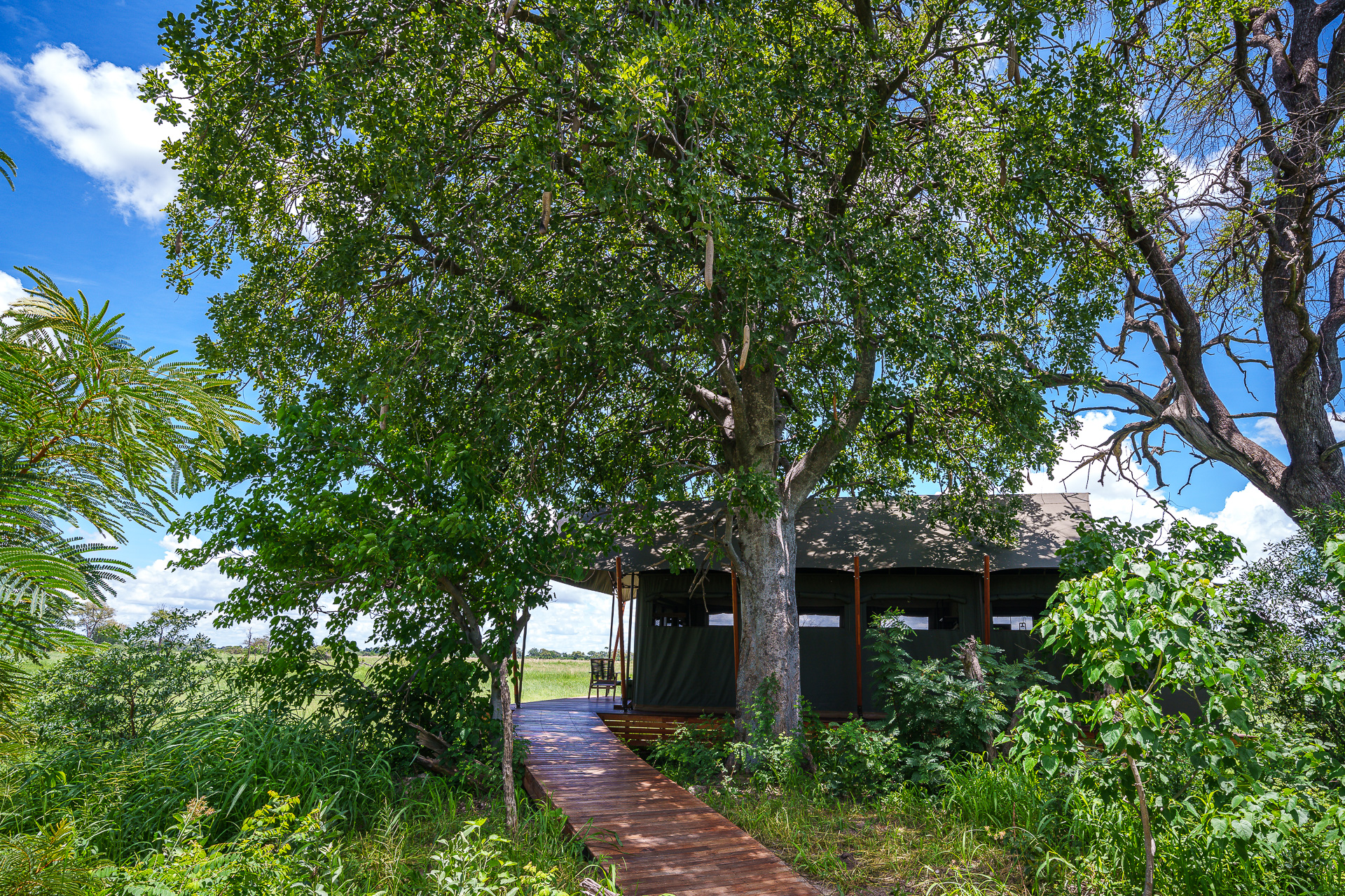 Karangoma’s six spacious tents, including a family suite, are nestled on a shaded peninsula overlooking an Okavango floodplain and a frequented wildlife path. Each tent features a bedroom, lounge, and indoor/outdoor showers, all styled with modern Hambukushu-inspired design and oriented toward the views. The camp includes open lounge and dining areas, a fire pit, and a plunge pool. Tents sit on low wooden decks, while ground-level paths weave through the natural vegetation, keeping guests closely connected to the landscape.