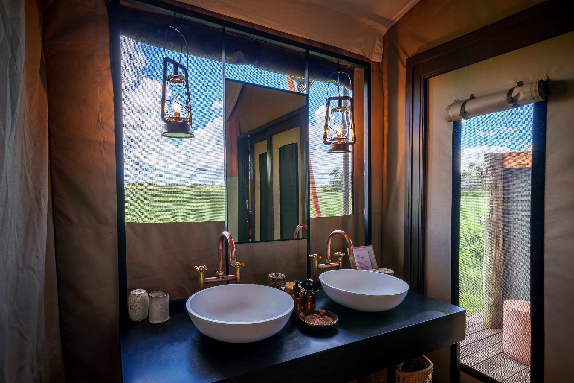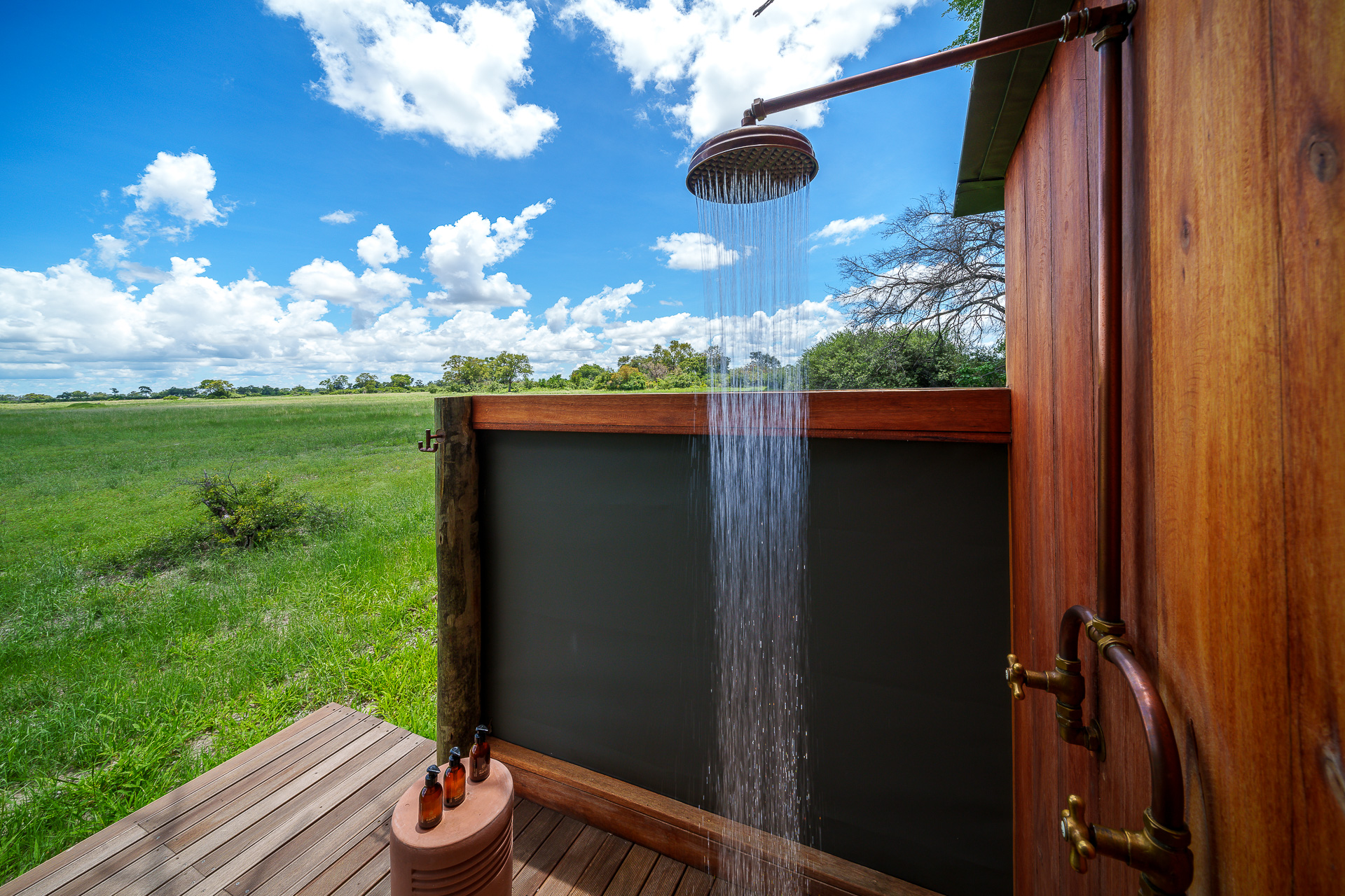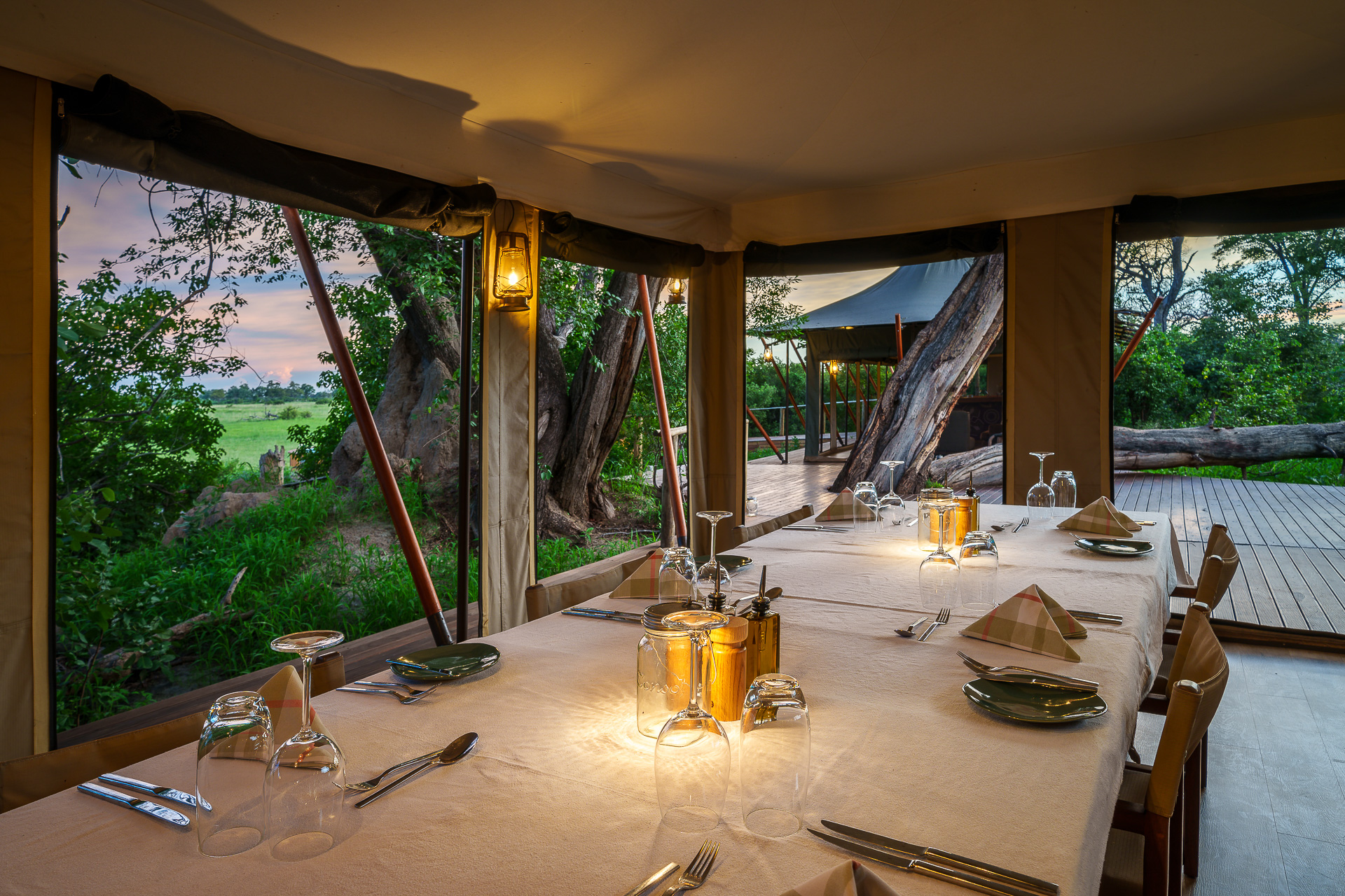 Karangoma’s six spacious tents, including a family suite, are nestled on a shaded peninsula overlooking an Okavango floodplain and a frequented wildlife path. Each tent features a bedroom, lounge, and indoor/outdoor showers, all styled with modern Hambukushu-inspired design and oriented toward the views. The camp includes open lounge and dining areas, a fire pit, and a plunge pool. Tents sit on low wooden decks, while ground-level paths weave through the natural vegetation, keeping guests closely connected to the landscape.