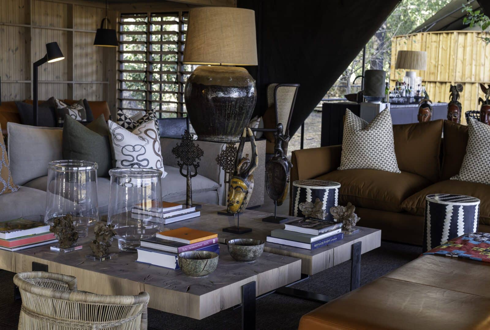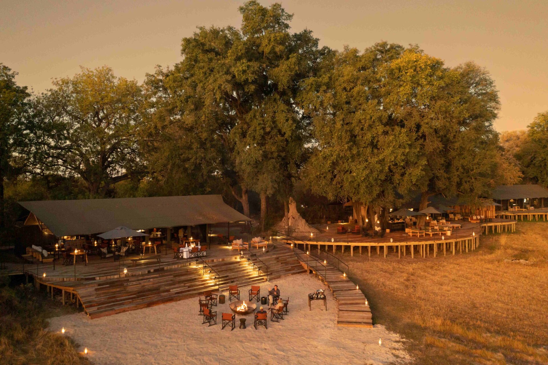 The heart of Kiri Camp are the elegant central lounge and dining areas, designed in the classic Machaba style—open, airy spaces with natural textures and understated luxury. Meals are enjoyed on expansive wooden decks overlooking the floodplains while each evening begins and ends around the firepit under the stars, a chance to share the days experiences with other guests. The camp features a bar serving a curated selection of wines, spirits, and cocktails. Guests dine privately unless they request their guide or manager to join them. Special bush dinners and sundowner setups add a sense of adventure and romance, allowing guests to dine in the heart of the wilderness.