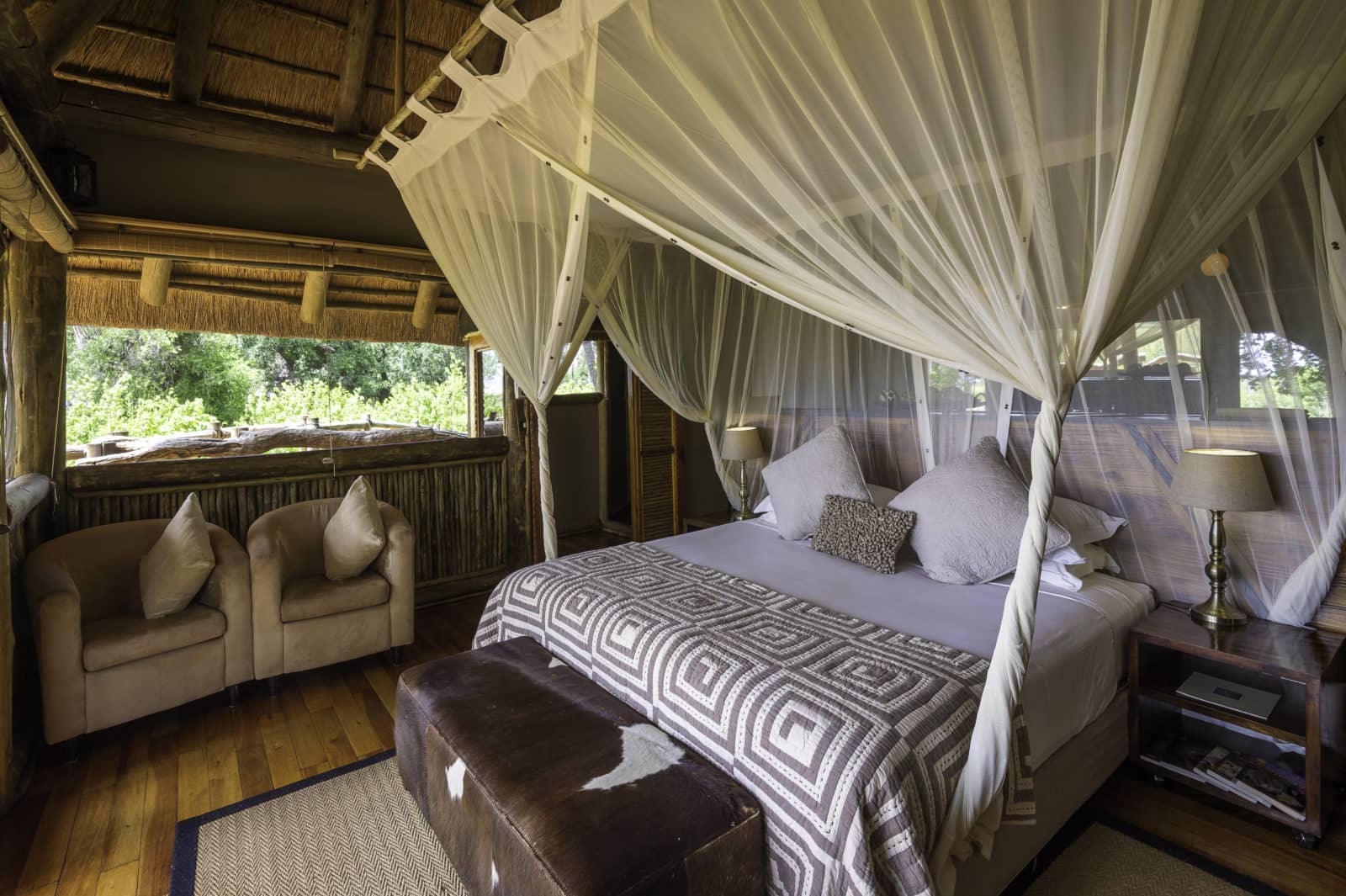 A thatched roof shades the main dining and lounge area which is completely open on one side and leads onto an expansive deck which, like the tents, overlooks the game rich flood plains. There are plenty of comfortable sofas and armchairs in which to settle and read the informative nature books and journals whilst enjoying a drink from the bar which is built around a large jackalberry tree.