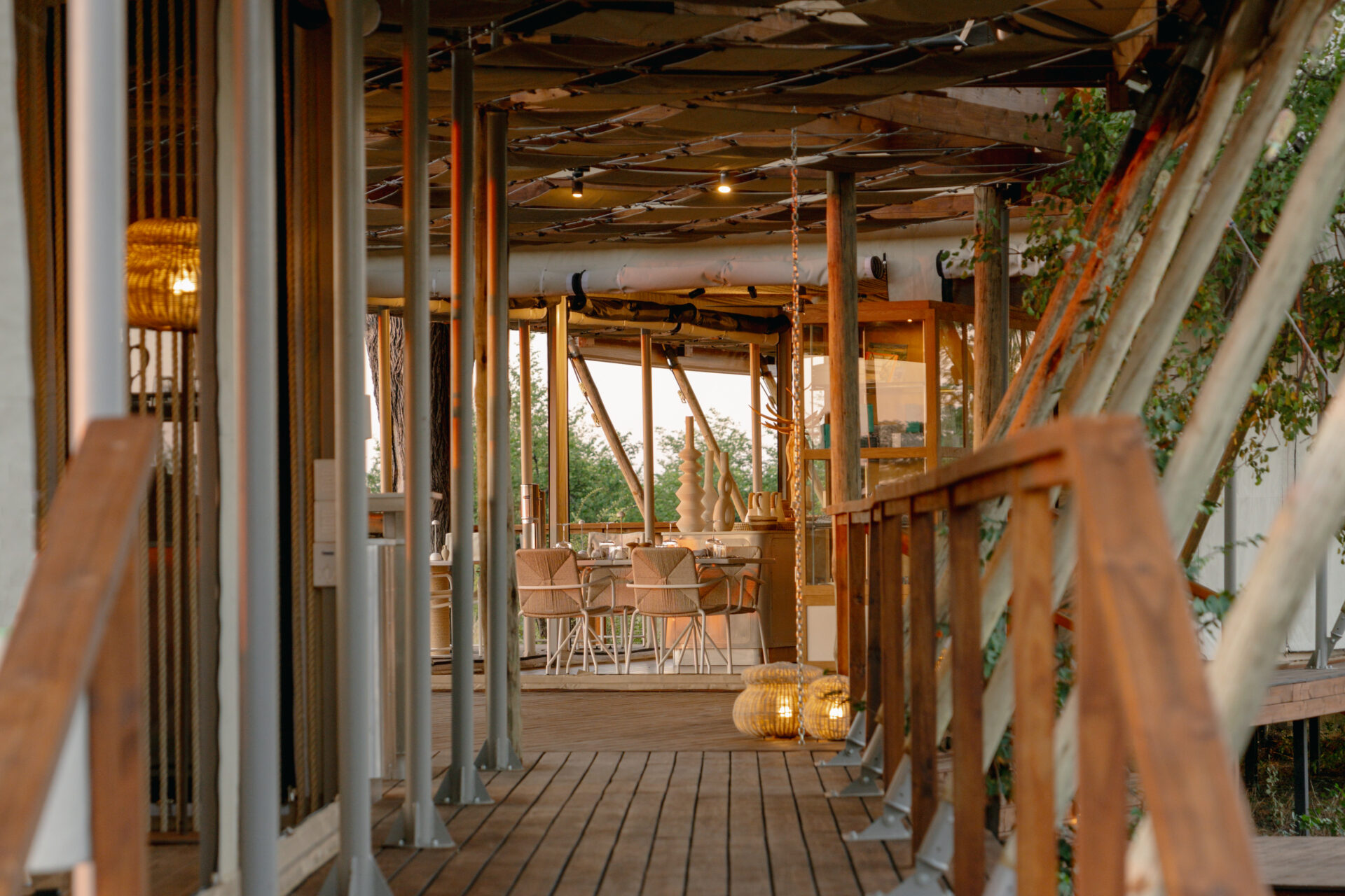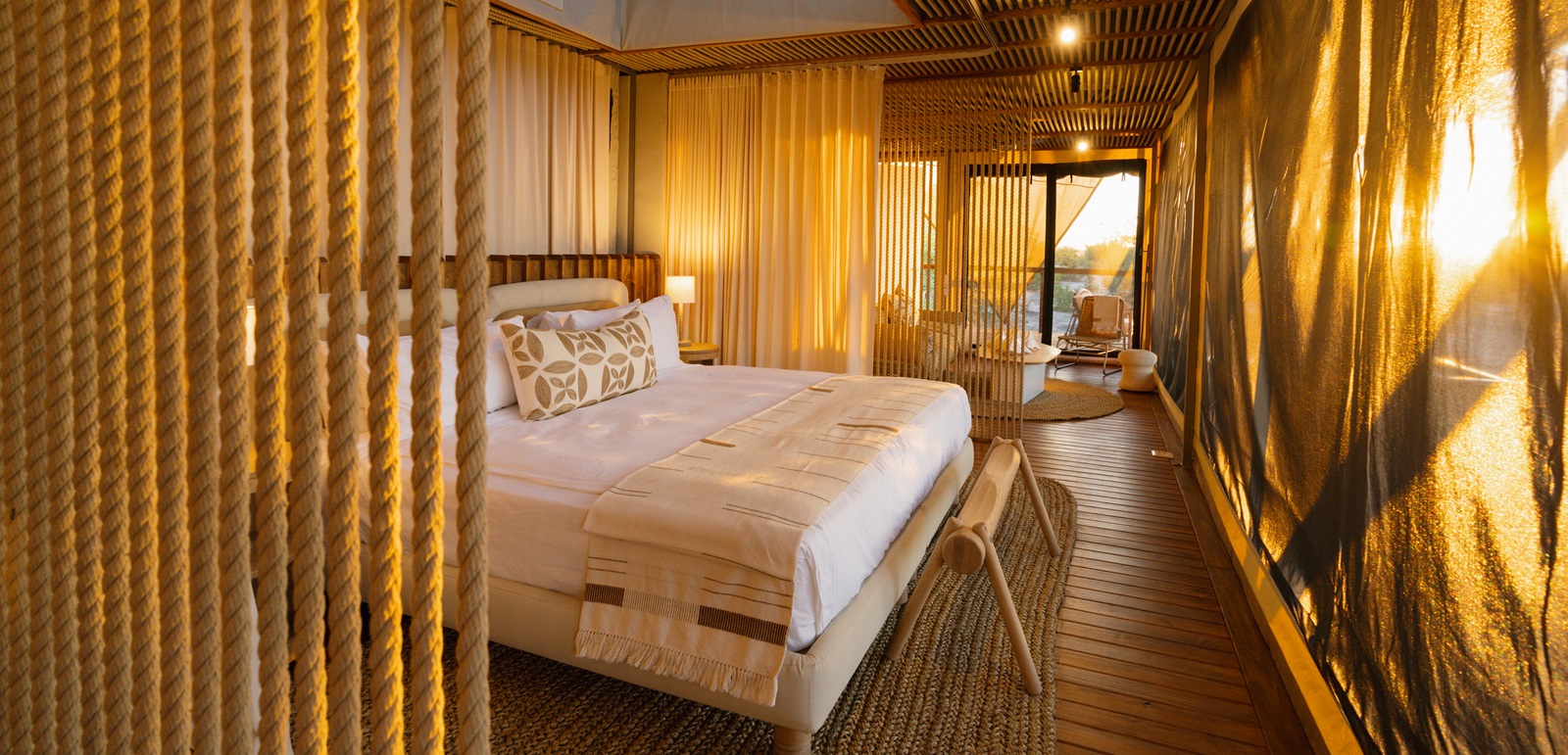 The camp itself is chic yet relaxed, with tents branch from both sides of the common area, equipped with an open-air lounge, dining area, bar, and fire pit. Guests are accommodated in 9 spacious tents – each with an elevated seating deck and small plunge pool plus a living area, bedroom, and bathroom. Interiors are intentionally minimalist yet tastefully luxurious with a clean earth-toned color palette. A well-positioned cooling system lies above the bed to help with the wildly varying temperatures of the Botswana bush. Strong Tents are well spaced for privacy – connected by elevated wooden footpaths – and overlook the grasslands.
