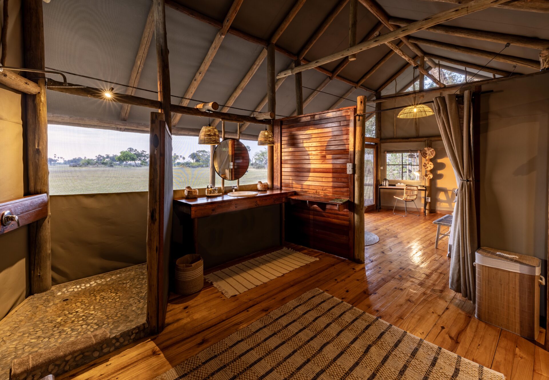 Mokolwane Camp consists of just seven lovely canvas tents, including one family tent. This simple but delightful little camp overlooks a productive waterhole allowing exciting wildlife viewing from the rooms and main area. The raised guest tents create a very special atmosphere, offering panoramic views of the Okavango and creating a very intimate feel. Each of the rooms has a private en-suite bathroom with with indoor showers as well as both hot and cold running water.