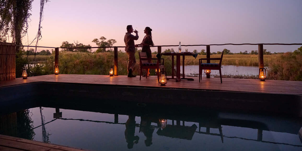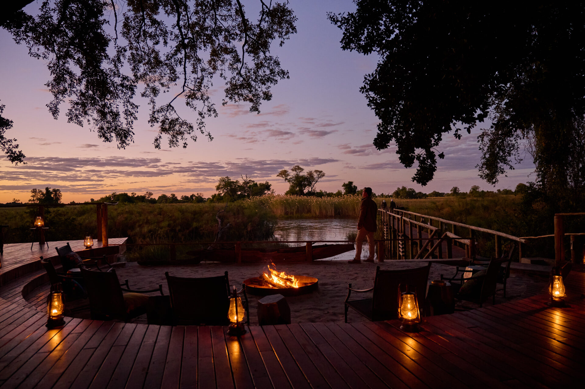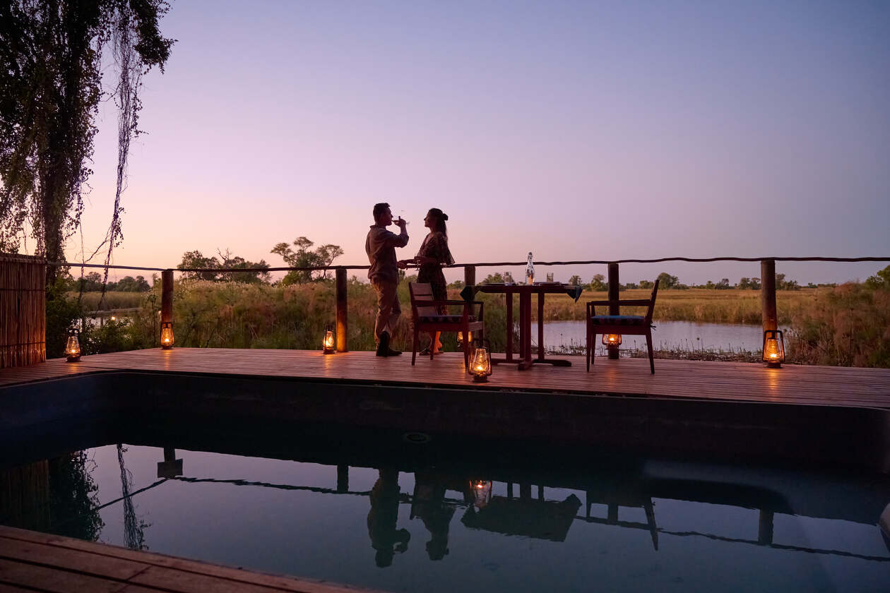 Nxamaseri Island Lodge has nine chalets each with a secluded location for privacy and all overlook the Panhandle waters and have a private deck to view the birds and animals discreetly at your leisure. The rooms are light and airy, with an open design allowing for cooling breezes from the water. The lodge features a communal central area for relaxation and socialising complete with bar, lounge area, fire pit and swimming pool.