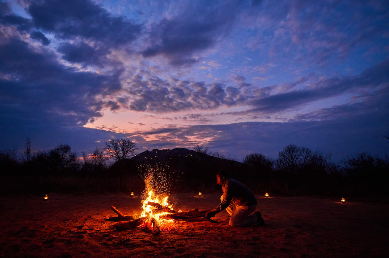 Highlights include wonderful views of the sun setting across these revered hills and watching the sun rise from the highest point in the Kalahari. Being onsite first thing in the morning allows for early access to the hills, to enjoy the most peaceful cultural tour of the hills. Overnight guests will enjoy a cultural interpretation from the local bushman community and learn about the heritage of this sacred site. There is the option to upgrade to a helicopter transfer to/from the camp, a highly recommended experience.