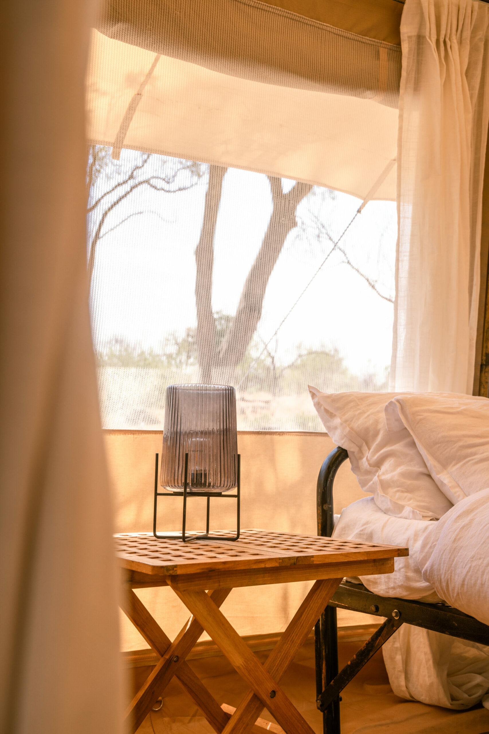 The guest tents have been custom designed – spacious, light and comfortable they are fully furnished with proper beds, luxurious linen, ensuite bathrooms with flushing loos and hot water in your bucket showers. There is thoughtful lighting and plenty of space to unpack and settle in to your home in the Botswana bush. Designed to be cool in the summer and cosy in the winter – plenty of thought has gone in to this camp. Solar powered fans are available in the tents too.