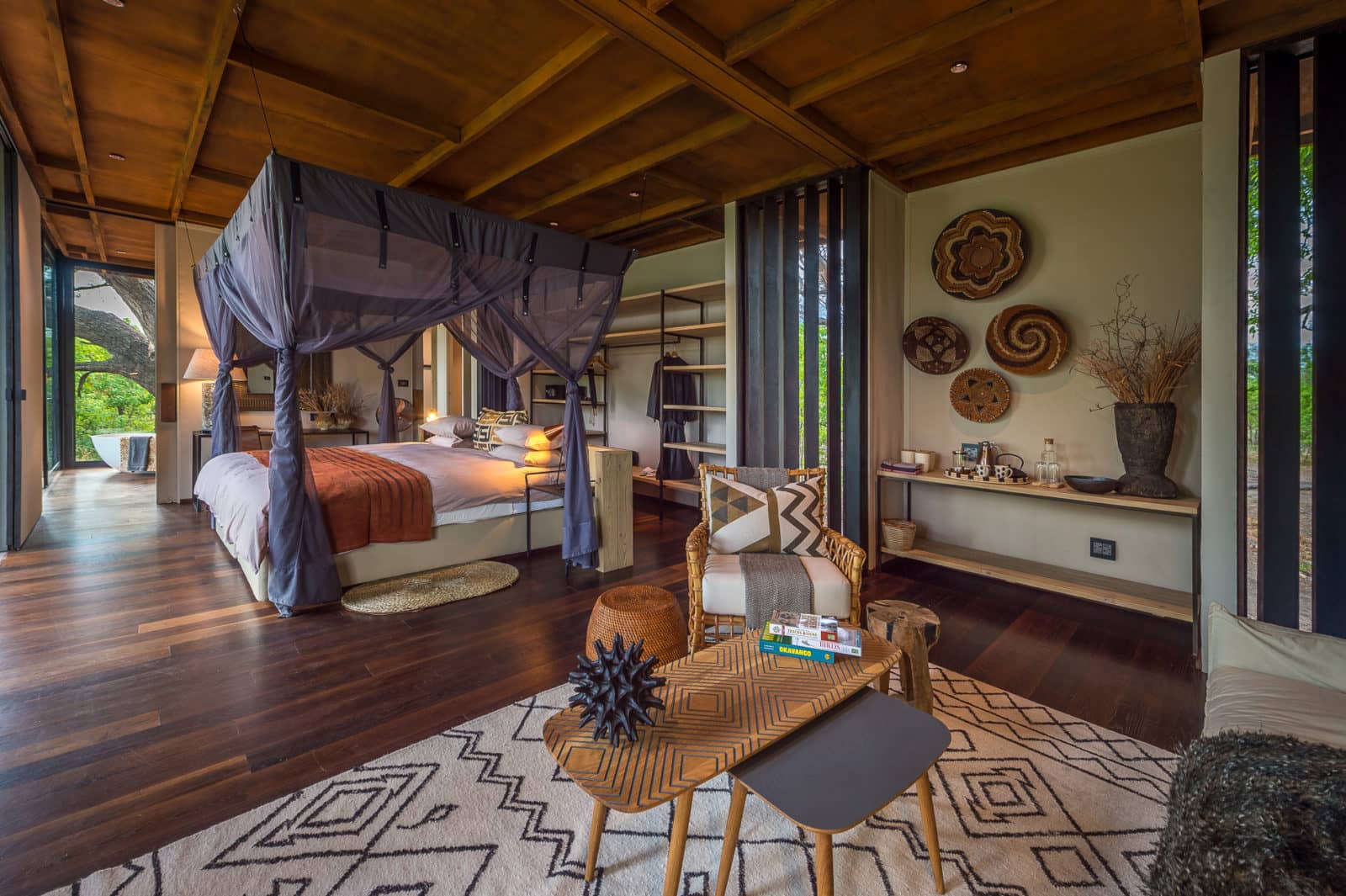 The magnificent main area at Qorokwe Camp overlooks a productive lagoon and the dining area, lounge, library and bar are built on raised wooden platforms, connected by walkways. The camp marries minimalist clean lines and a stylish contemporary aesthetic with a real connection with the natural world. The rooms and main areas are modernist: flat roofed with wood panels, wrought iron and geometric shapes and large sliding doors that welcome in and frame the magnificent wilderness of the Delta. Traditional touches such as woven baskets provide a connection with the ancient but still practised arts of the people of Botswana. Peaceful rectangular water features edge the lounge area and frame the view onto the lagoon. The generously sized infinity pool is set slightly lower and adjacent to the firepit.