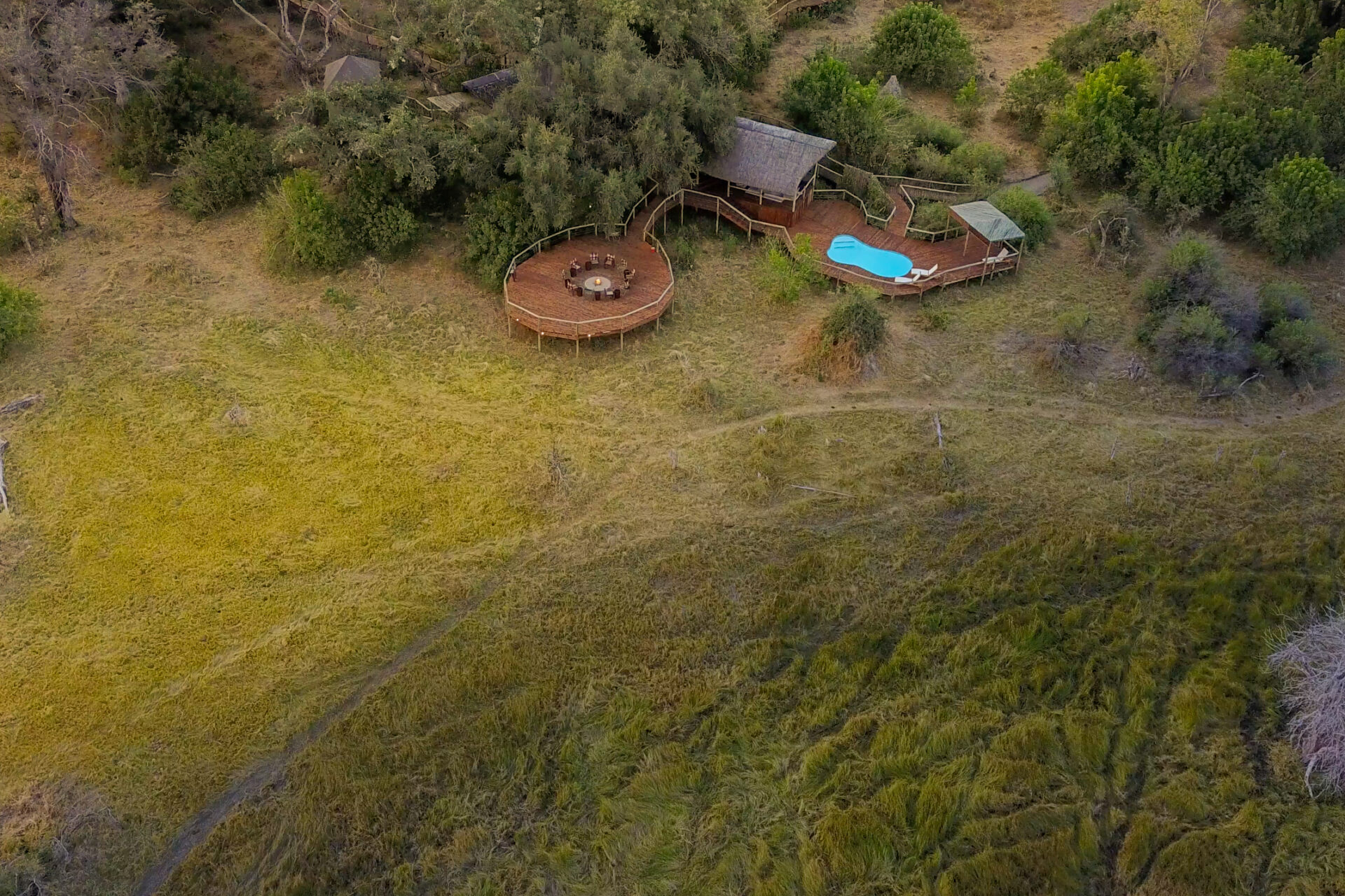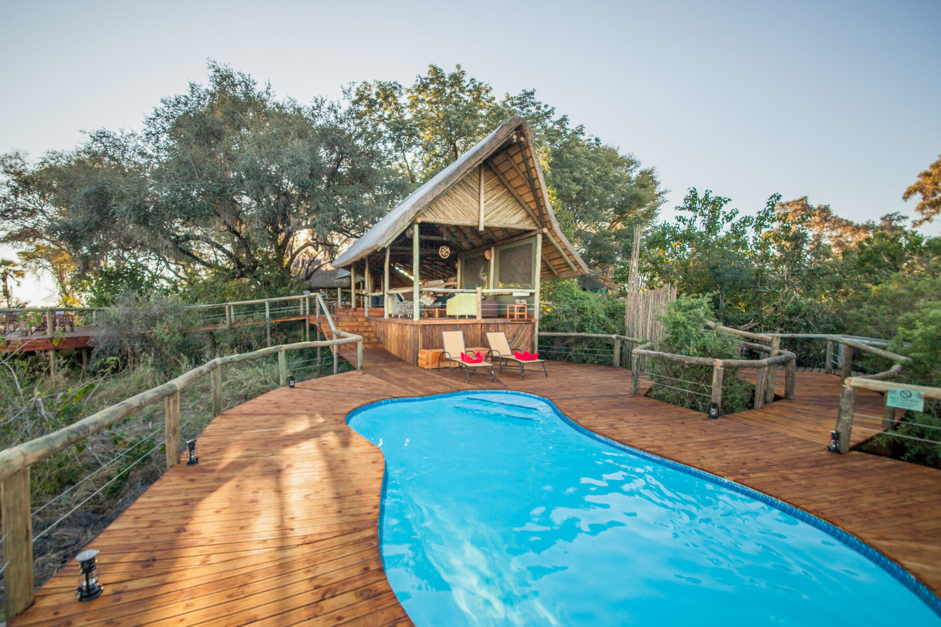 The central area has been built in keeping with Kwando’s other properties with open high thatched spaces allowing guests to relax and enjoy the natural surroundings while watching wildlife and birds from the comfort of an armchair or the bar. Meals are taken together family style in the dining area. The swimming pool and curio shop complete the luxurious.