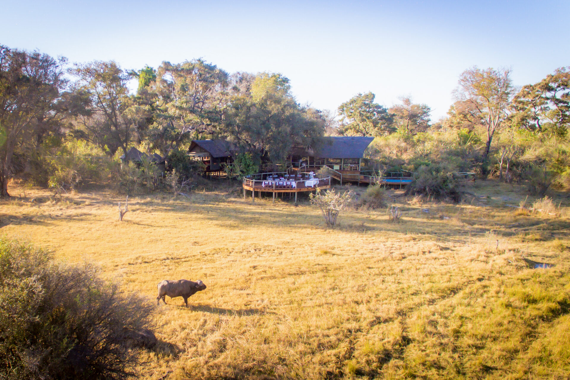 Rra Dinare Camp lies on the 67,000 acre Santawani concession, which it shares with its sister camp, Mma Dinare (‘Mother Buffalo’) meaning sightings of other vehicles are rare and controlled. The concession is made up of Mopane woodland (a favoured home for many animals) for the main part though the area around the Gomoti River and widespread floodplains is open and offers pretty Delta landscapes.