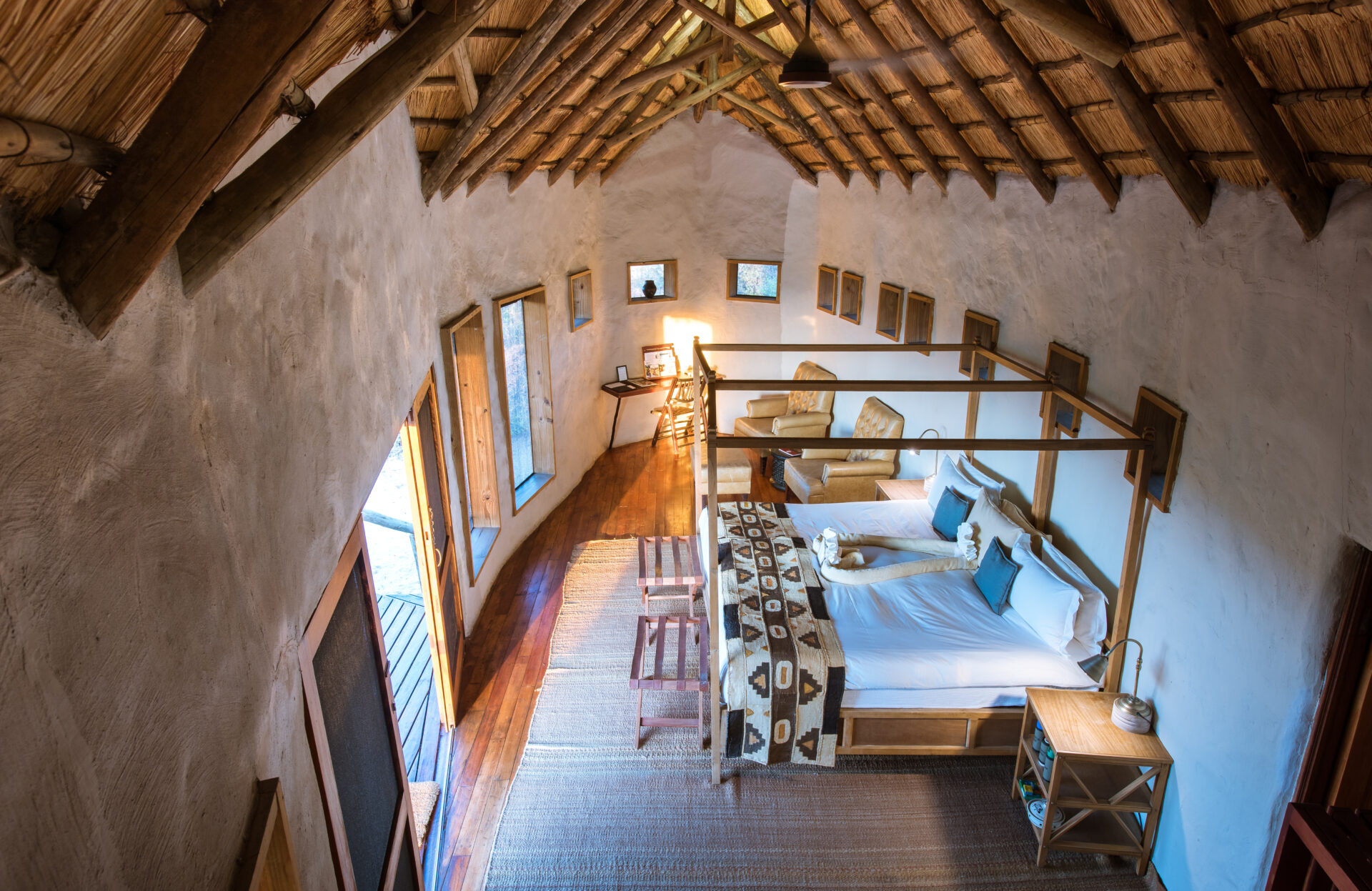 The central area is furnished with comfortable sofas and armchairs, providing a great vantage point to watch the waterhole below. A small swimming pool and shaded sundeck area are perfect for whiling away siesta time.