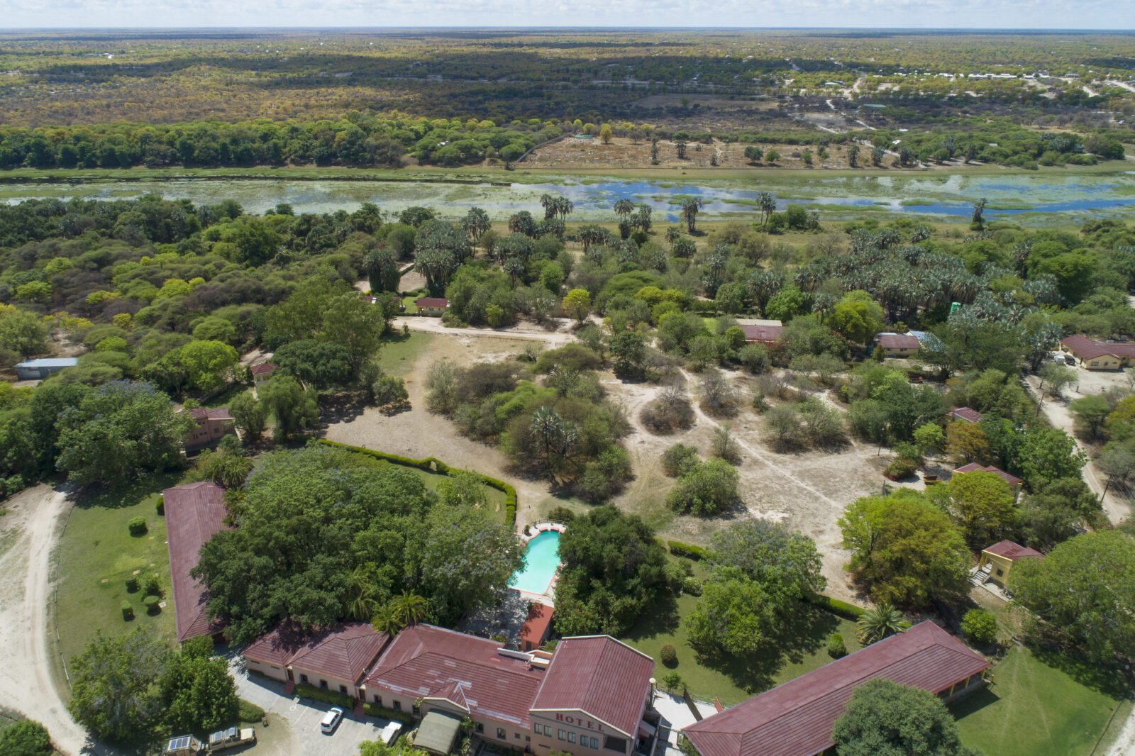 Immersed in mature gardens on the banks of the Thamalakane River, the Sedia Hotel offers a comfortable and affordable base in Maun before or after your safari. Simple but comfortable rooms look out on to beautiful gardens. The hotel has a friendly and relaxed atmosphere, and is pleasant terrace restaurant and pool are popular with locals and visitors alike. The hotel is located just 20 minutes from the Airport with a number of nice dining options nearby.